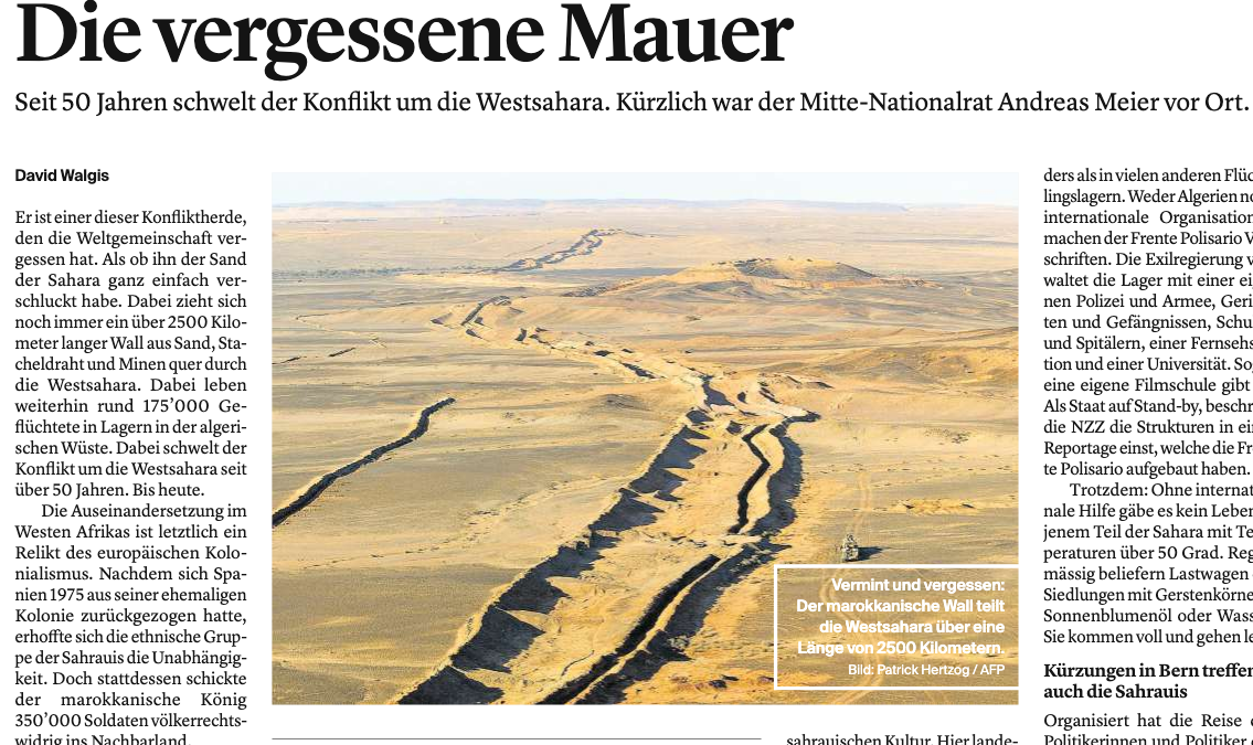 6. Februar 2025„Seit 50 Jahren schwelt der Konflikt um die Westsahara. Kürzlich war der Mitte-Nationalrat Andreas Meier vor Ort.“ So lautet der Titel der CH Media wie „Aargauer Zeitung“, „Luzerner Zeitung“ und „Badener Tagblatt“. Hier geht es zur Online-Version und auf Wunsch kann der ganze Artikel als PDF angefordert werden:
