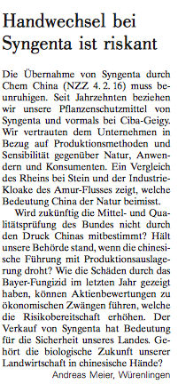 Stellungnahme Syngenta-Übernahme11. Mai 2022Neu-Grossrat Andreas Meier: «Ich freue mich riesig»11. Mai 2022 Handwechsel bei Syngenta ist riskant Kategorien Medienspiegel Stichworte Beitrag in der NZZ vom 11. Februar 2016 zur Syngenta-Übernahme durch Chem China. Teilen