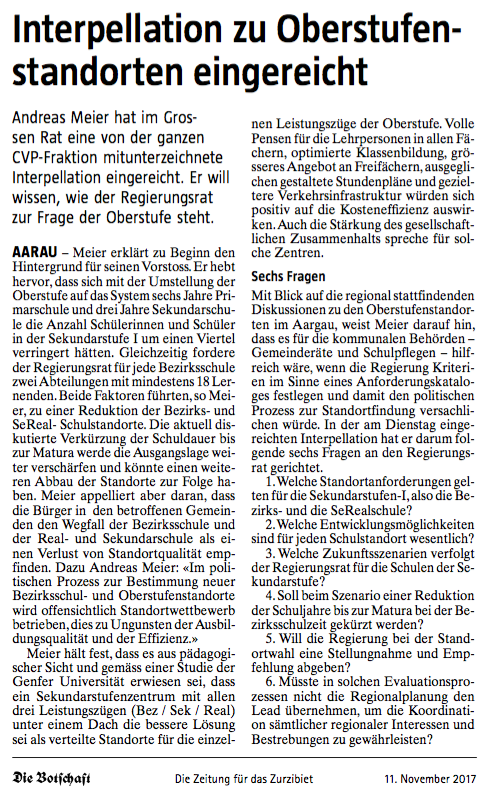 Zurzibieter Polit-Prominen verwöhnt die Gäste im «Baumhuus»11. Mai 2022Oberstufen Aaretal: Einzelne Zurzibieter Grossräte äussern sich jetzt doch11. Mai 2022 Interpellation zu Oberstufenstandorten eingereicht Kategorien Medienspiegel Stichworte Die Botschaft Teilen