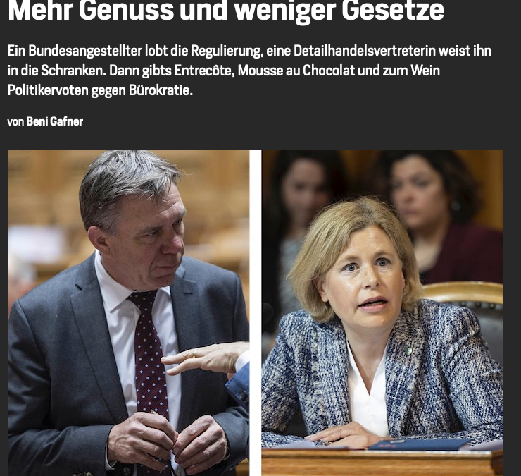 29. März 2024„Es war mehr als ein munterer Erfahrungsaustausch unter Parlamentsmitgliedern vergangene Woche im Restaurant Fédérale am Bundesplatz: Die erste Veranstaltung einer neuen Parlamentariergruppe, die sich ‚Genuss und Verantwortung‘ nennt, ins Leben gerufen von SVP-Ständerätin Esther Friedli und Mitte-Nationalrat Andreas Meier.“ Das schreibt die JUNGFRAU ZEITUNG und hier geht es zum ganzen Bericht.