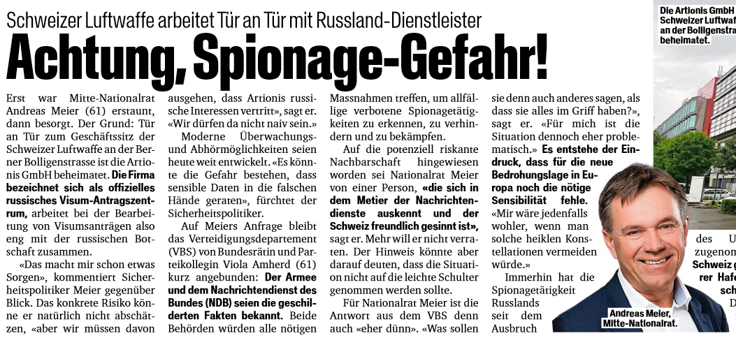 20. September 2023«Wir dürfen da nicht naiv sein.» Tür an Tür zum Geschäftssitz der Schweizer Luftwaffe in Bern residiert das russische Visum-Antragszentrum. Hier geht es zum Artikel in der Zeitung „Blick“