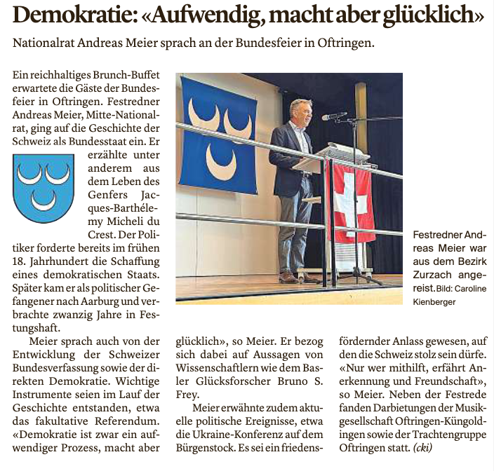Taiwanische Delegation besucht Park Innovaare13. Juli 2024„1. August-Feier im Zeichen der Mobilität“5. August 2024 Demokratie: „Aufwendig, macht aber glücklich“ Kategorien Medienspiegel News Stellungnahmen Stichworte 1. AugustArgovia TodayBundesfeier 2024LaufenburgNeue Fricktaler ZeitungOftringen ZOFNGER TAGBLATT berichtet über die Rede an der Bundesfeier in Oftringen… Teilen