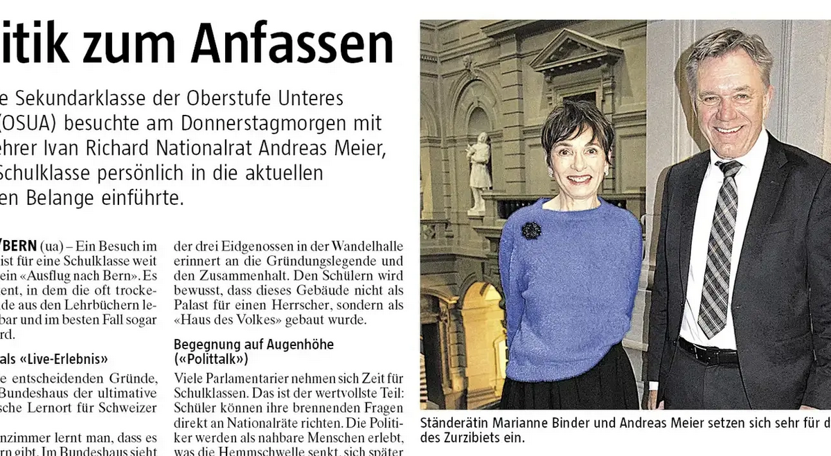 18. März 2026„Ein Besuch im Bundeshaus ist für eine Schulklasse weit mehr als nur ein ‚Ausflug nach Bern‘. Es ist der Moment, in dem die oft trockene Staatskunde aus den Lehrbüchern lebendig, greifbar und im besten Fall sogar spannend wird.“ Hier geht es per Mausklick zum ganzen Artikel und zu einem Bericht über die „Lücke zwischen Spital- und Pflegegesetz“ für Menschen mit Querschnittlähmungen oder neurologischen Erkrankungen wie Amyotrophe Lateralsklerose (ALS), Multiple Sklerose (MS) oder Parkinson.