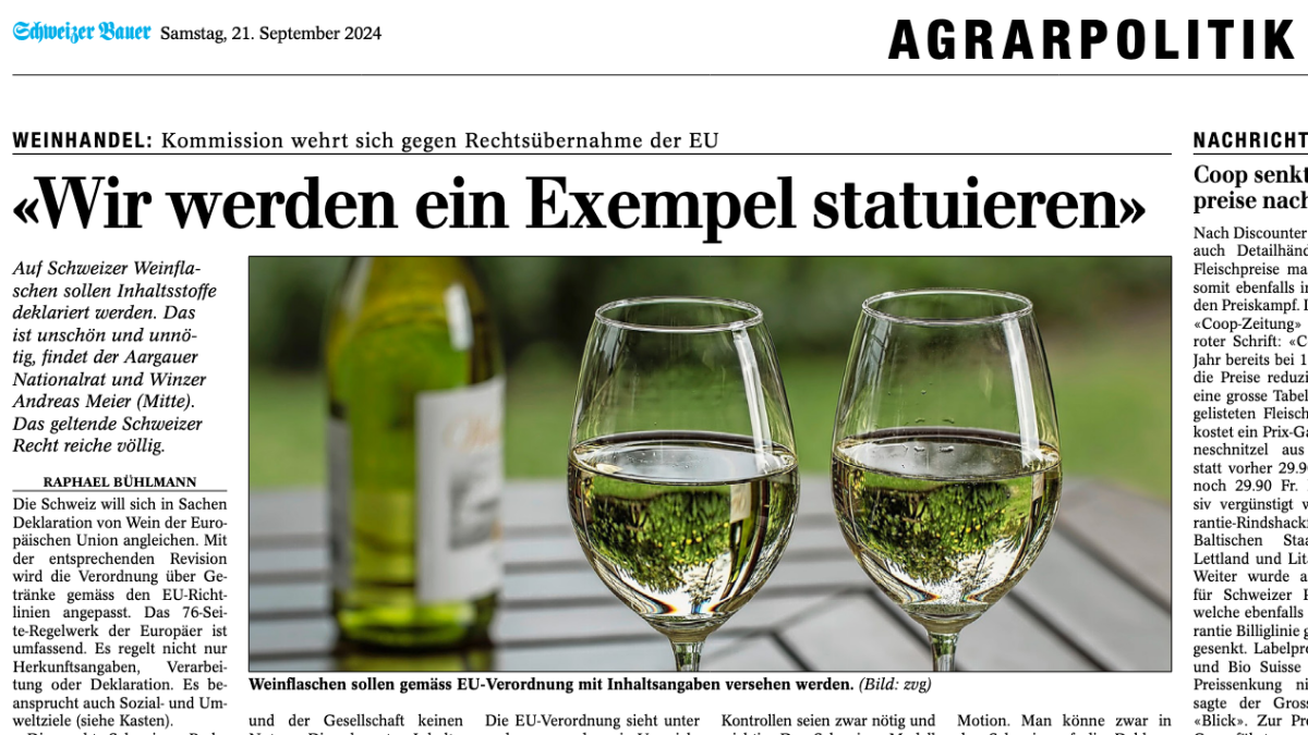 27. September 2024„Auf Schweizer Weinflaschen sollen Inhaltsstoffe deklariert werden. Das ist unschön und unnötig, findet der Aargauer Nationalrat und Winzer And reas Meier (Mitte). Das geltende Schweizer Recht reiche völlig.“ Den ganzen Bericht in der Zeitung SCHWEIZER BAUER finden Sie hier…